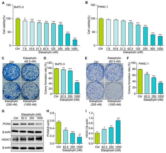 Elaiophylin inhibits the proliferation of BxPC-3 and PANC-1 cells. (A) The bar chart indicates the cell viability of BxPC-3 cells treated with elaiophylin at indicated concentrations. (B) The bar chart indicates the cell viability of PANC-1 cells treated with elaiophylin at indicated concentrations. (C,E) Representative images of colony formation of BxPC-3 and PANC-1 cells treated with elaiophylin at indicated concentrations. (D,F) The bar chart indicates the colony-formation rate. (G) Representative western blotting images of PCNA, HDAC1, and β-actin in BxPC-3 cells treated with elaiophylin at indicated concentrations. The original western blotting images are shown in Figures S2 and S3. (H,I) Bar charts indicate the ratio of PCNA/β-actin and HDAC1/β-actin. Error bars, S.D.: * p < 0.05; ** p < 0.01; *** p < 0.001. Data are presented as mean ± SD from three independent experiments (n = 3).