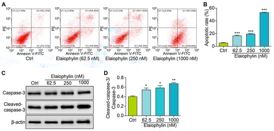 Elaiophylin induces cell apoptosis in BxPC-3 cells. (A) Representative flow cytometry images showing the cell apoptosis of elaiophylin-treated BxPC-3 cells stained with Annexin V-FITC and PI reagent. (B) The bar charts indicate the cell apoptotic rate. (C) Representative western blotting images of Caspase-3, Cleaved-caspase-3, and β-actin in BxPC-3 cells treated with elaiophylin at indicated concentrations. The original western blotting images are shown in Figure S4. (D) The bar charts indicate the ratio of Cleaved-caspase-3/caspase-3. Error bars, S.D.: * p < 0.05; ** p < 0.01; *** p < 0.001. Data are presented as mean ± SD from three independent experiments (n = 3).