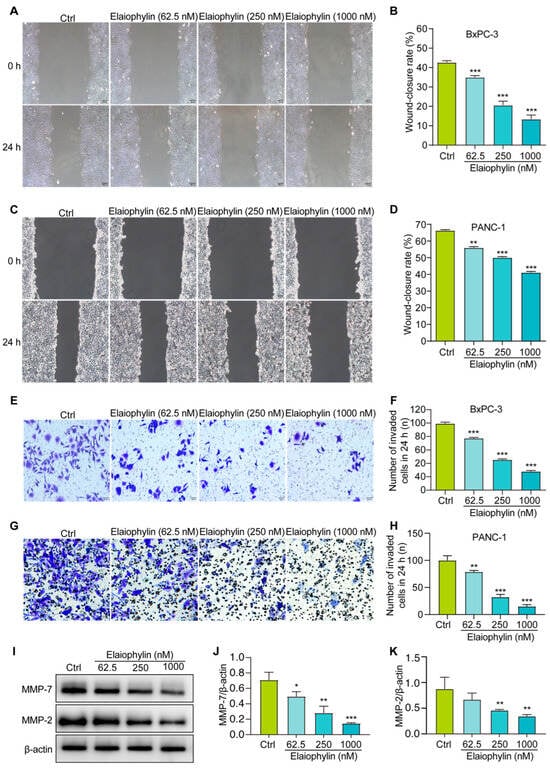 Elaiophylin inhibits the migration and invasion of BxPC-3 and PANC-1 cells. (A,C) Representative cell scratch images of BxPC-3 and PANC-1 cells treated with elaiophylin at indicated concentrations. Magnification: 10×, scale bar: 100 µm. (B,D) The bar chart indicates the wound-closure rates of BxPC-3 and PANC-1 cells. (E,G) Representative cell invasive images of elaiophylin-treated BxPC-3 and PANC-1 cells stained with crystal violet reagent. Magnification: 20×, scale bar: 50 µm. (F,H) The bar chart indicates the number of invaded cells in 24 h. (I) Representative western blotting images of MMP-7, MMP-2, and β-actin in BxPC-3 cells treated with elaiophylin at indicated concentrations. The original western blotting images are shown in Figure S5. (J,K) Bar charts indicate the ratio of MMP-7/β-actin and MMP-2/β-actin. Error bars, S.D.: * p < 0.05; ** p < 0.01; *** p < 0.001. Data are presented as mean ± SD from three independent experiments (n = 3).