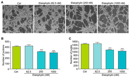Elaiophylin inhibits angiogenesis. (A) Representative images of elaiophylin-treated HUVECs showing the formation of capillary-like structures. Magnification: 10×, scale bar: 100 µm. (B) The bar chart indicates the number of junctions. (C) The bar chart indicates the number of nodes. Error bars, S.D.: *** p < 0.001. Data are presented as mean ± SD from three independent experiments (n = 3).