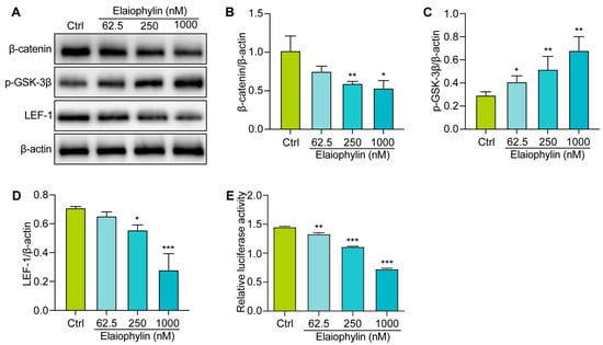 Elaiophylin inhibits the activation of the Wnt/β-Catenin signaling pathway in BxPC-3 cells. (A) Representative western blotting images of β-catenin, p-GSK-3β, LEF-1, and β-actin in BxPC-3 cells treated with elaiophylin at indicated concentrations. (B–D) Bar charts indicate the ratio of β-catenin/β-actin, p-GSK-3β/β-actin, and LEF-1/β-actin. The original western blotting images are shown in Figure S6. (E) The bar chart indicates the relative luciferase activity of the TOPFlash firefly luciferase. Error bars, S.D.: * p < 0.05; ** p < 0.01; *** p < 0.001. Data are presented as mean ± SD from three independent experiments (n = 3).
