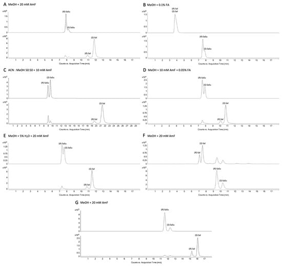 Chromatograms from method development for the most promising stationary phases teicoplanin and vancomycin. A teicoplanin column was chosen for the testing of mobile phase compositions. (A–E) Chromatograms using a teicoplanin-based column (4.6 mm I.D. × 100 mm; 2.7 µm, poroshell) for different mobile phase compositions and (F) for comparison with a vancomycin-based column (4.6 mm I.D. × 100 mm; 2.7 µm, poroshell). Chromatograms obtained with the finally optimized method are shown in (G) using a teicoplanin-based column (4.6 mm I.D. × 150 mm; 2.7 µm, poroshell).