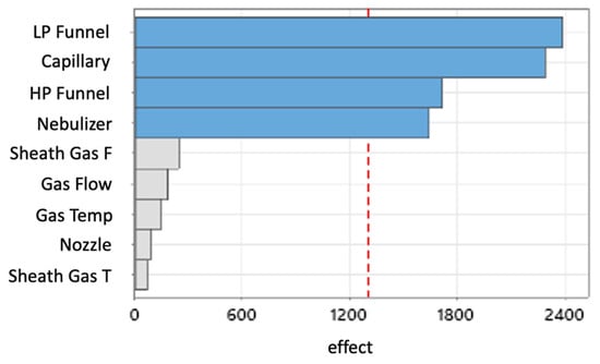 Pareto diagram of the effects (effect) of low-pressure funnel voltage (LP Funnel), capillary voltage (Capillary), high-pressure funnel voltage (HP funnel), nebulizer pressure (Nebulizer), sheath gas flow (Sheath Gas F), drying gas flow (Gas Flow), drying gas temperature (Gas Temp), nozzle voltage (Nozzle), and sheath gas temperature (Sheath Gas T) on the abundance of the quantifier transition (m/z = 318.0 → 218.1) of salbutamol-4′-O-sulfate. The analyte was injected from a urine sample and ionized in ESI− mode. Red dashed line is the reference line for significance. Blue bars that cross the reference line highlight parameters that have a significant effect on the abundance of the quantifier transition, grey bars indicate there is no significant effect.