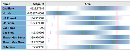 The full factorial design was additionally performed to better investigate the ion source parameters. A prediction for the settings of the source parameters targeting the maximization of the peak area for the quantifier of salbutamol-4′-O-sulfate (m/z = 318.0 → 218.1) was generated (Figure 4).
