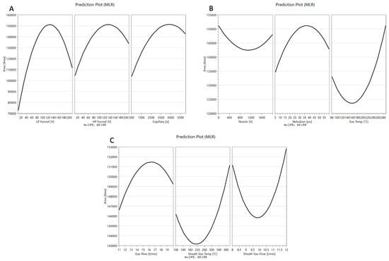 Predicted changes of the peak area for the salbutamol-4′-O-sulfate quantifier (m/z = 318.0 → 218.1) by changing the setpoint of a single variable. The change in the response is shown for adjusting (A) low-pressure funnel voltage (LP Funnel), high-pressure funnel voltage (HP funnel), capillary voltage (Capillary), (B) nozzle voltage (Nozzle), nebulizer pressure (Nebulizer), drying gas temperature (Gas Temp) and (C) drying gas flow (Gas Flow), sheath gas temperature (Sheath Gas Temp) and sheath gas flow (Sheath Gas Flow).