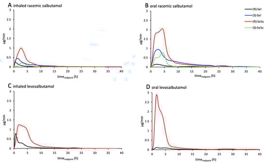 Excretion rates of both enantiomers of salbutamol and salbutamol-4′-O-sulfate were calculated for both inhaled and oral administration of racemic salbutamol as well as for levosalbutamol. For all administrations, the excretion rates of (R)- as well as (S)-salbutamol did not exceed 1 µg/min (Figure 8). When administered orally, the maximum excretion rate of (R)-salbutamol was lower than the rate for inhaled administration. In contrast, for (S)-salbutamol, the maximum excretion rate was higher after oral administration than after inhalation. After racemic salbutamol was administered, excretion rates of (R)-salbutamol were lower than for (S)-salbutamol.