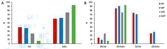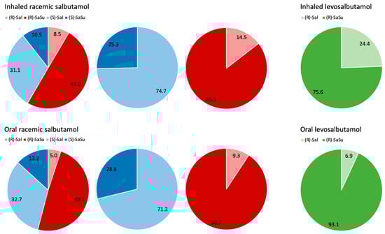 After administration of racemic salbutamol, more than half of the total urinary excreted amount was recovered as (R)-parent compound or its metabolite (Figure 10). Regarding the amount of excreted (R)-enantiomer, 85% consisted of (R)-salbutamol-4′-O-sulfate, while (S)-salbutamol was mainly excreted as parent compound after inhalation (SAI: 75%) as well as after oral administration (SAP: 71%). The proportion of sulfate metabolite found in the urine was slightly higher after oral administration for both enantiomers.