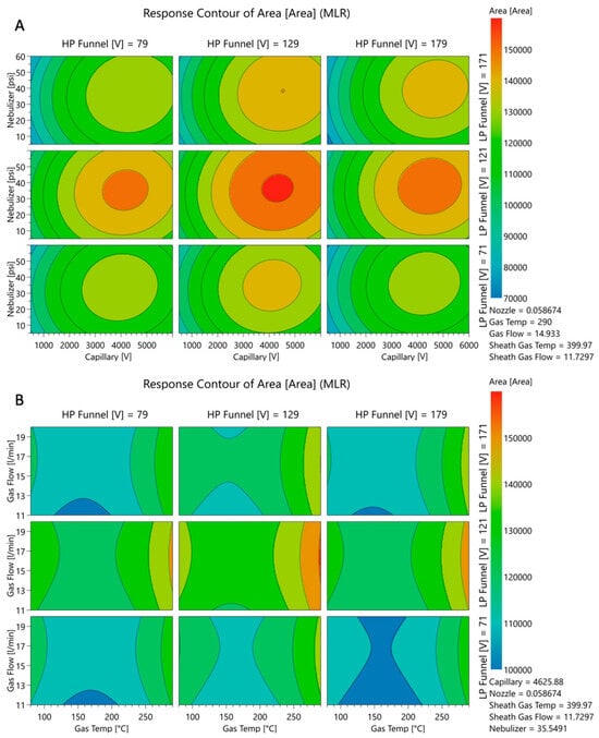 The MSSD for the optimization of the ion source settings led to a well-optimized ionization setup. The elimination of variables in the method development did not account for the complexity of the ionization. Furthermore, the optimization had to be focused on only one analyte, since the second- and third-step experiments were generated based on the results of the previous step. Referring to the step-by-step optimization of the ionization for the quantifier of salbutamol-4′-O-sulfate, the created knowledge space for the method did not allow for evaluation of the results. Only the effects of altering the capillary voltage, low-pressure funnel voltage, and high-pressure funnel voltage were finally described by the quadratic model. A better understanding of the changes in peak areas by altering the setpoints for the variables was achieved by running a full factorial experimental design including all nine factors equally. Figure 12 visualizes the prediction of the peak area—and therefore the ionization efficiency—based on the quadratic model of the full factorial design (FFD). The generated knowledge space around the deviating settings which were used in the final HPLC-MS/MS method for high-pressure funnel, low-pressure funnel, capillary, nebulizer, and drying gas flow are shown. The constant variables in this visualization were set to the predicted optima of the full factorial model (right left corner). Low- and high-pressure funnel were 121 V and 129 V, respectively, in the final HPLC-MS/MS method and are indicated in the third and fourth axes in Figure 12, respectively. Additionally, the predicted effects of capillary voltage and nebulizer pressure (Figure 12A) and of drying gas flow and drying gas temperature (Figure 12B) are shown. When the funnel setting was changed from 50 V to higher or lower values, the red areas were not reachable at all. The crucial impact of the funnel settings was elucidated by both of the prediction models, and the predicted values were only 5 V and 4 V different for low- and high-pressure funnel voltages, respectively. The applied 3400 V for capillary voltage was still in the red area although the FFD predicted capillary voltage was 4626 V (Figure 12A). The nebulizer pressure optimum was predicted via FFD as 35.5 psi and was set after MSSD experiments to 37 psi and thus was still in the red area of the design space. A bigger difference was seen for the drying gas flow rate of 11.7 L/min predicted via FFD and the actual applied drying gas flow rate of 20 L/min in the HPLC-MS/MS method. The red area which indicates optimal condition is only visible as small stripe in Figure 12B. The applied drying gas flow rate would be slightly out of the red area. Only minor differences were seen in the sheath gas flow rate setting compared to the FFD prediction. In conclusion, the applied method systematically developed with the multiple-step screening design was re-evaluated with the more comprehensive design space created with the full factorial design and was classified as highly suitable.