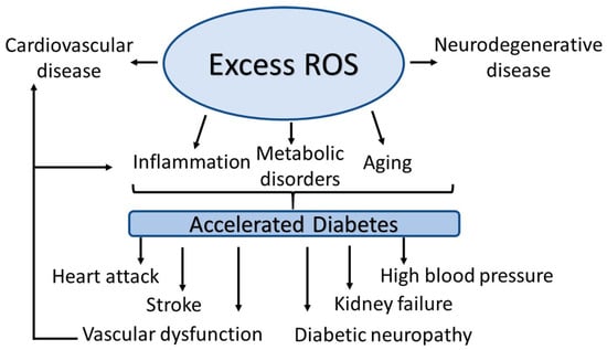 ROS are formed as natural byproducts of cellular metabolism [33] and are tightly controlled through well-coordinated cellular mechanisms. Increased ROS formation can range from low to severely high levels. At low levels, ROS act as regulators of certain signaling pathways [34] in both cell biology and physiology. At high levels, ROS cause an array of diseases, including cardiovascular, neurodegenerative, metabolic disorders, cancer, inflammation, and aging (Figure 1). ROS are involved in the degradation of pathogens and serve as intracellular signaling molecules in steady state, indicating their protective roles in infection and normal biological processes. However, their prolonged effects result in abnormal cellular physiology, which exacerbates ROS production, leading to progressive oxidative damage and the subsequent initiation of cell death. Moreover, oxidative stress-induced cell death appears to be the most proximal event of diabetes, leading to diabetic micro- and macro-angiopathic complications. Diverse components of the oxidative stress microenvironment affect cell metabolism and cell-cell homeostasis [16]. Furthermore, damage from these stressors can include mutations in mitochondrial DNA (mDNA) in patients with diabetes mellitus [35], somatic point mutations in age-related diseases [36], and immune-related somatic point mutation genes in diabetes [37].