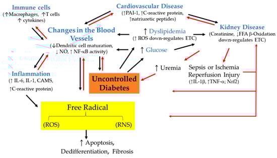 Feed-forward (black arrows) and feed-back (red arrows) events where diabetes can contribute to ROS formation. Hyperglycemia, dyslipidemia, hypertension, kidney disease, and inflammation all lead to the formation of ROS. As a consequence, elevated levels of ROS might directly contribute to fibrosis, apoptosis, and dedifferentiation, or indirectly via enhanced inflammation, reduced FFA β-oxidation, or NO bioavailability. Diabetes itself may contribute to the generation of cytokines and vascular remodeling, which can also contribute to the generation of ROS. Under normal circumstances (non-diabetic response), ROS and RNS play vital roles in numerous biological processes. ↑—indicates an increase in level; ↓—represents a decrease in level.