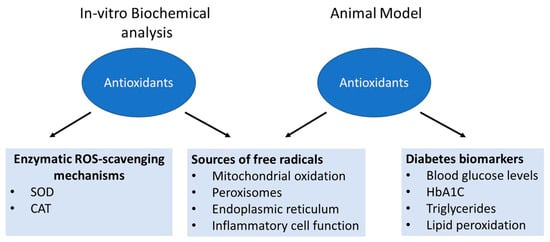 Many plants that possess phenolic compounds are found to have an important protective role in scavenging free radicals during oxidative stress [122]. These studies assess the antioxidant properties of polyphenolic compounds in both in vitro and in vivo models for studying diabetes, as summarized in Figure 4. Here, we provide a brief review of the most frequently used antioxidants to assess their beneficial pharmacological effects on the animal body and humans.