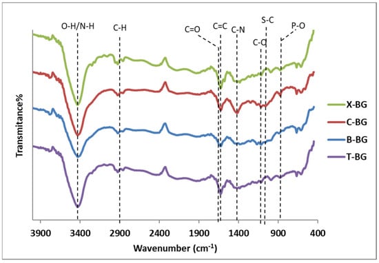 Figure 1 shows the FT-IR spectra of synthesized bio-graphenes. In all of the samples, the stretching vibrations of the C=C, C-O, and C=O bonds were observed at about 1115, 1630, and 1720 cm−1. Also, the broad bands at about 3300–3600 cm−1 were related to stretching vibrations of O-H and N-H bonds, and the absorption bands at about 2925 and 2895 cm−1 indicate the symmetric and asymmetric C-H vibrations. In the X-BG, C-BG, and T-BG samples, which show the N-doping, the C-N absorption bands appeared at 1425 cm−1, and the presence of P and S dopants in the C-BG sample was observed at 895 cm−1 and 1080 cm−1, indicating the S-C and P-O bonds in this doped graphene.