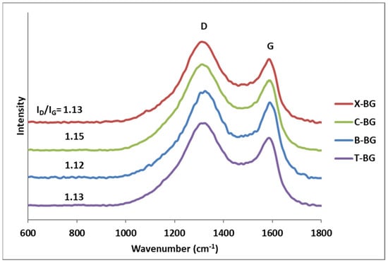 Figure 2 shows the Raman spectra of synthesized bio-graphenes. Two characteristic graphene bands of D and G were observed for all samples at about 1584 and 1313 cm−1, respectively. The first-order G band is the primary mode which represents the sp2 planar configuration of carbon and the second-order D band is the disorder band which represents a ring mode of carbon adjacent to a defect. So, the intensity of the D band was increased by increasing the defects in the graphene structure. The doping of heteroatoms increased the degree of disorder and the intensity ratio of D to G bands (ID/IG) was increased. As shown in Figure 3, the highest ID/IG ratio is related to the C-BG graphene which was derived from Chitosan. It indicates the higher defects in the C-BG graphene structure due to the doping of N, P, and S. The lowest ID/IG ratio is related to the B-BG which shows the graphene structure with no element doping.