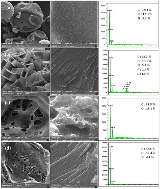 SEM images and EDX spectra of (a) X-BG; (b) C-BG; (c) B-BG; and (d) T-BG.