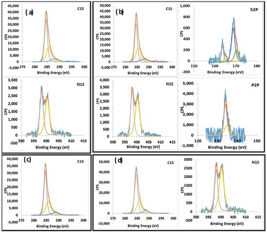 To confirm the placement of N, P, and S in the graphene structures, XPS analysis was conducted (Figure 4). In all of the samples, the C1s peaks are deconvoluted into three bands at about 284.5, 285.5, and 289.0 eV, which corresponded to C-C, C-O/C-N, and C=O species, respectively. Samples X-BG, C-BG, and T-BG show the doping of nitrogen in the graphene structures. The pyridinic N and pyrrolic N (398.5, and 400.5 eV) are the nitrogen species which are characterized in all of the samples. The amount of pyridinic N is higher than the pyrrolic N species in the X-BG and C-BG samples. In the T-BG sample, the pyrrolic N is dominant. Previous results show that these nitrogen species are effective in catalytic oxidative reactions [43,44,45,46]. The amounts of nitrogen were measured as 4.5, 5.1, and 4 for X-BG, C-BG, and T-BG, respectively, which is in agreement with the EDX analysis. The presence of P and S in the B-BG structure was also confirmed by XPS analysis (Figure 4b). The results show the bonding of phosphor with oxygen (P-O) at 134.2 and 134.9 eV and the bonding of sulfur with carbon (S-C) and oxygen (C-SOx-C) at 168.9 eV and 170.6 eV, respectively. The amount of P and S obtained was 0.3 and 1.4, respectively.