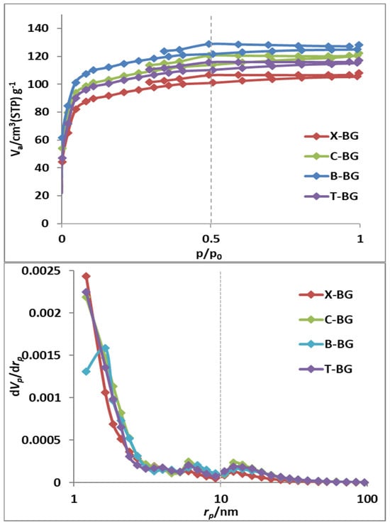 Since the amount of adsorption is related to the porosity of the substrate, the porosities of synthesized bio-graphenes are discussed in Figure 5. As shown in the N2 adsorption/desorption isotherms and pore size distribution curves, the highest surface area with different pore distribution was observed in the B-BG sample. This observed increase in surface area with different pores is dependent on its initial precursor, creating a porous structure with special morphology. After B-BG, the largest surface area is related to the C-BG sample, which has the highest amount of dopants. The structure of the primary polymer precursor and the presence of various dopants in the final graphene structure have created a hollow cubic structure and increased surface area in this compound. As shown in Figure 4, the X-BG and T-BG samples show almost the same surface area. These two samples show more similar nitrogen amounts and morphologies.