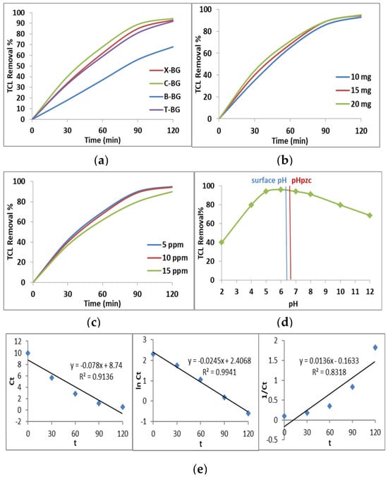 Catalytic efficiency of synthesized bio-graphenes in the removal of TCL (a); effect of different amount of C-BG catalyst (b); effect of different TCL concentrations (c); effect of pH (d); and kinetic model of TCL removal (e).