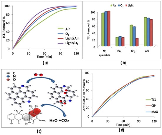Figure 7b shows the quenching test results. In both conditions, the presence of air and O2, the formation of oxygenated radicals was observed (Figure 7b). In the air condition, hydroxyl (•OH) radical is the dominant active species, while in the presence of O2, the role of the •O2− radical increases. By irradiating light to the system, the rate of reaction and the yield of TCL removal increases (Figure 7a), indicating an increase in the production of oxygenated radicals. According to Figure 7b, the active radical in this system is the •O2− radical.