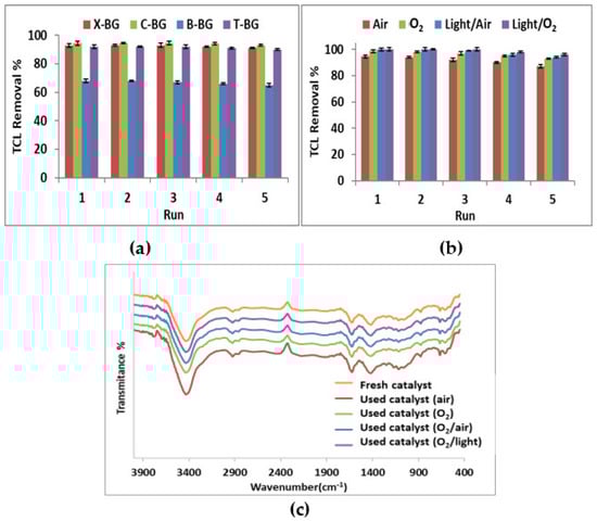 Recovery of catalysts in TCL removal under air bubbling after washing the catalysts (a); recovery of C-BG catalyst without washing at different conditions (b); and FT-IR spectra of fresh and used C-BG catalysts in different catalytic reaction conditions (c).