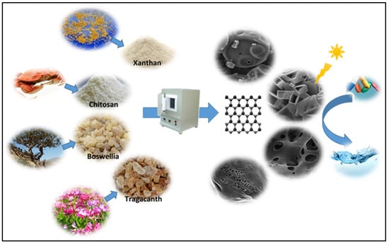 Natural precursors were used for the synthesis of bio-graphenes. Xanthan, Chitosan, Boswellia, and Tragacanth gums were purchased from a local shop with 70–80% purity and used after washing with water to remove the dust. Tetracycline (TCL), ciprofloxacin (CIP), and amoxicillin (AMX) were selected as the model antibiotics to test the removal efficiency of synthesized bio-graphenes.