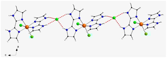 Detail of the one-dimensional motif generated by H-bonds (dashed red lines) connecting [RuCl2(H2biim)2]+ cations and chloride anions in 1.