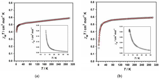 For 2, χMT values continuously decrease with decreasing temperature to a value of approximately 0.53 cm3mol−1K at 40 K. They subsequently continue decreasing faster, reaching a final value much lower than that of 1: 0.18 cm3mol−1K at 2.0 K (Figure 6). This decrease in the χMT values observed in both compounds at a medium–high range of temperature would account for the 2T2g ground term of this paramagnetic metal ion, which exhibits spin–orbit coupling (SOC) and an important orbital contribution, as previously observed for mononuclear Ru(III) complexes [22,23]. Furthermore, a maximum of the magnetic susceptibility occurs at TN ≈ 3.0 K in the χM versus T plot for 2 (see inset in Figure 6b), which would be assignable to an antiferromagnetically coupled system, indicating a zero spin value (S = 0) for 2. In contrast, no maximum of the magnetic susceptibility is observed in the χM versus T plot for 1 (see inset in Figure 6a).