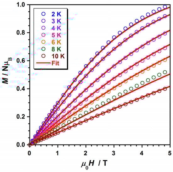 Indeed, we have reproduced the experimental magnetic data that draw the χMT versus T curves of 1 and 2 by using the obtained values: Δ = 1057 cm−1, κ = 0.90, λ = −828 cm−1 and θ = −0.54 cm−1 for 1, and Δ = 1679 cm−1, κ = 0.92, λ = −938 cm−1 and θ = −3.37 cm−1 for 2. In addition, we used the PHI program to further study and compare the results of our fitted values [53], thus obtaining the following parameters: g = 2.42(1), θ = −0.50(1) cm−1 and TIP = 296 × 10−6 cm3mol−1 for 1 and g = 2.22(1), θ = −3.40(1) cm−1 and TIP = 12.8 − 10−6 cm3mol−1 for 2, with the θ values being very close to the ones obtained through the former theoretical model. Next, these computed parameters were further employed to treat the field dependence of the molar magnetization (M versus H) curve, which is obtained at several temperatures and is given in Figure 7. This magnetization fitting process was not possible for 2, given the strong correlation with antiferromagnetically coupling and the S = 0 of the system (Figure S1).
