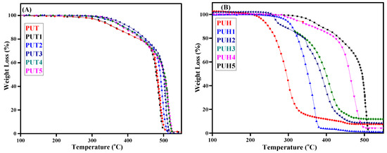 TGA curves of all the synthesized samples of PU composites (A) TGA curves of the PUT series (B) TGA curves of the PUH series.