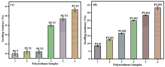 The polarity of the polymers plays a significant role in deciding the application of the polymers and their related composites, particularly those that involve the interaction with water or any other solvents [41,42,47,48,49,50]. Water, being the universal solvent, is one of the prime solvents that can show a significant impact on any kind of composite. The water absorption tendency of all the samples of the PUT and PUH series is presented in Figure 3A,B, respectively. The unique architecture of PU contains both polar and nonpolar groups in the backbone. Hence, the contribution of both HS and SS can absorb or repel water accordingly. The water absorption tendency in the case of the PUT and PUH series increased, indicating that chitosan is the main factor responsible for the absorption of water. In order to understand this effect, it is necessary to take a closer look at the polarity of each monomer involved in the formation of the composites.