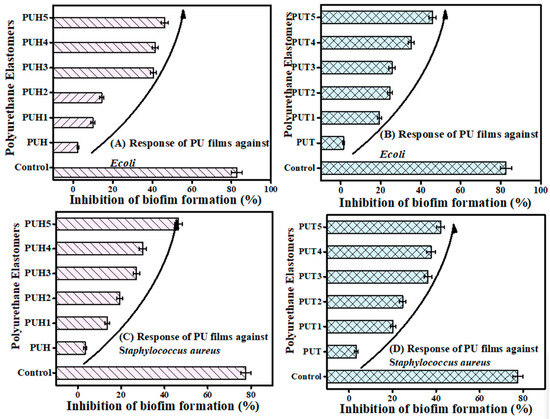 Inhibition of film formation data of PU composites; (A) Inhibition of film formation data of PUT against E. coli (B) Inhibition of film formation data of PUH against E. coli (C) Inhibition of film formation data of the PUT series against S. aureus (D) Inhibition of film formation data of the PUH series against S. aureus.