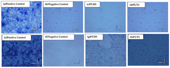 Phase contrast microscopy was used to observe the biofilm inhibition aptitude of PU composites [43,54]. The experiment was performed using a few drops of S. aureus and E. coli, which were cultured on glass slides. The incubation was carried out at 37 °C for 14 h. The PBS solution was used for the washing of PU composite slides. After rinsing and staining the slides, the biofilms were dissolved using 30% glacial acetic acid. The controlled slides of samples, negative PBS control, and positive control with ciprofloxacin were developed without PU composite suspensions. The slides of all the suspensions were inspected microscopically.