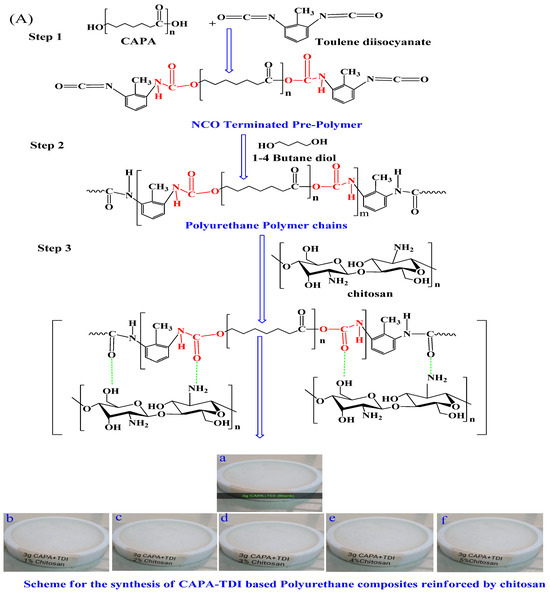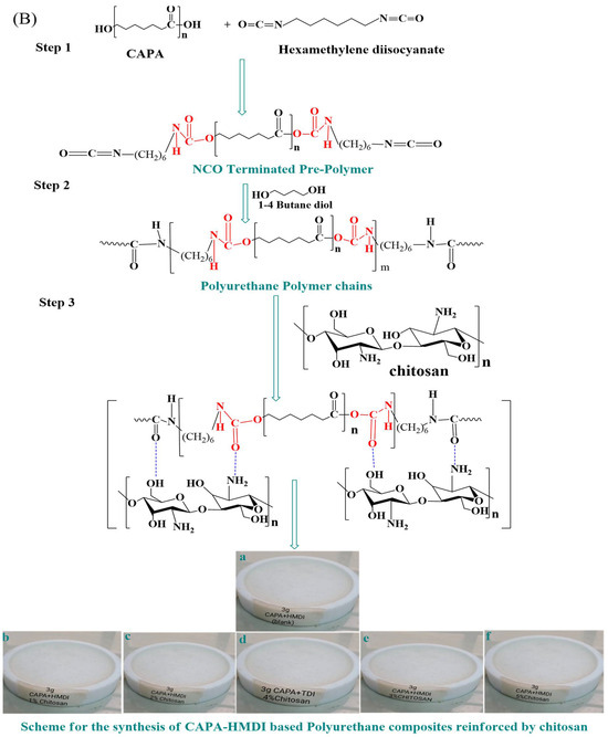 The fabrication of pristine PU samples and the chitosan-reinforced composites was carried out by using in situ polymerization. The details of the synthetic procedure are mentioned in our previous publications [4,20,41]. The experimental setup for the synthesis of PU is simple yet inevitable. The fabrication process itself consists of several vital steps and conditions. The initial step of PU fabrication was performed in a conventional round bottom flask amended with four openings/necks. These necks were used for the quick fitting of some essential apparatus, such as a mechanical stirrer for the stirring of monomers, a thermometer to maintain and record the temperature, a reflux condenser to maintain the temperature of the assembly, and N2 gas supply for the expulsion of oxygen. The pyrogallol solution was used to maintain the stream of nitrogen flow at the rate of 10–12 bubbles/min. The reaction temperature was maintained throughout the reaction with the aid of an oil bath. During the first step of the polymer’s fabrication, the stoichiometrically mandatory volume of diisocyanate was added to the reaction flask and the temperature was maintained up to 60 °C. The macrodiol CAPA was dispensed in the diisocyanate in the required quantity while the temperature was increased up to 100 °C. The unremitting stirring developed NCO-terminated PU prepolymer in approximately one hour. For the termination of NCO-ended chains, vigorous stirring was carried out using BD, resulting in the conversion of NCO-terminated prepolymer chains into the final product. In order to maintain the consistency of the fluid, the chain termination process proceeded for 15 min with the aid of acetone (20 wt %). The pristine PU sample was obtained by lowering the reaction mixture temperature. The fabrication of composites was carried out by the addition of chitosan in the stochiometric ratio. Chitosan was used in concentrations from 1–5 (wt %), whereas the hard segment contents were maintained up to 30 (wt %). The reinforcing agent chitosan was suspended in accordance with the optimization standards of protocols, including temperature, reaction stirring speed, and atmosphere of the fabrication. In order to avoid the interference of the atmospheric oxygen, the reaction was carried out by continuous purging of nitrogen gas. In order to attain the consistent mixing of chitosan, vigorous stirring was sustained at 1300 rpm with the help of a mechanical stirrer. Polytertaflouroethylene (PTFE) molds were used to cast the fabricated samples. The degassing at 50 °C was carried out under vacuum for 8 h until the evaporation of solvent took place smoothly. The ultimate sample drying proceeded gradually at different temperatures and different time intervals. In the first step of drying, the film was desiccated at 70 °C for 36 h. In the second step, drying was performed at 110 °C for 4 h. The film thickness of the dried composites was maintained at 2 ± 0.05 mm. All the fabricated composites were stored in a desiccator under ambient conditions for analysis. A similar procedure was followed to fabricate two series of composites. Each series contained six samples, including a pristine sample of PU. An inclusive detail of the fabricated samples in terms of stoichiometry is provided in Table 3. The schemes for the fabrication of two series of PU composites are illustrated in Figure 8A,B. All the fabricated samples were subjected to FTIR, TGA, DMA, and SEM for structural, thermal, mechanical, and morphological characterizations. The water retention tendency was observed using the swelling test. The biocompatibility of the fabricated samples was evaluated using hemolytic activity and the inhibition of biofilm formation against E. coli and S. aureus. The results of biofilm inhibition were also supported by phase contrast microscopy.