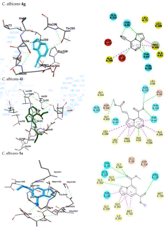 The binding energy values of the reference compound atorvastatin were in all cases lower than those for simvastatin (Table 3). A similar pattern of binding energy values was observed for the entire series of compounds. For example, enaminones 2a and 2c and the N-alkyl pyrrole 8c showed more negative values than simvastatin for all the species of Candida spp. herein tested. The pyrrolo[1,2-a]pyrazine 4l had better binding energy values than simvastatin on five of the yeasts. In contrast to the experimental antifungal effect, enaminone 1a only exhibited better binding energy values than simvastatin on CaHMGR and CkHMGR. Overall, the binding energy values found for these series of compounds were better than those previously described for other derivatives proposed as inhibitors of CgHMGR [40,44].