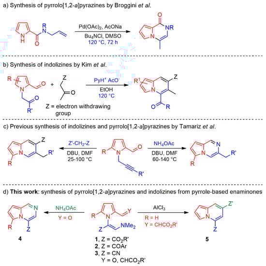 Previously reported synthetic procedures: (a) a Pd(II)-promoted vinyl cyclization to achieve pyrrolo[1,2-a]pyrazines; (b) a condensation process to afford indolizines; and (c) the use of 2-formylpyrroles as the starting material to obtain pyrrolo[1,2-a]pyrazines and indolizines. (d) With the current strategy, pyrrole-based enaminones (1–3) were the building block for the preparation of pyrrolo[1,2-a]pyrazines (4) and indolizines (5) [23,25,30].