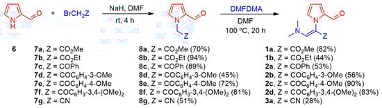Thus, the alkylation of 6 with alkyl bromoacetates 7a and 7b under basic conditions produced the series of N-substituted pyrroles 8a [40] and 8b in good yields (Scheme 2). Similarly, the reaction of 6 with the series of bromoacetophenones 7c–f generated 8c–f, and the reaction of 6 with bromoacetonitrile (7g) gave pyrrole 8g. The thermal treatment of 8a–g with N,N-dimethylformamide dimethyl acetal (DMFDMA) afforded the series of enaminones 1a–b and 2a–d in acceptable yields as a single Z isomer, as well as enaminone 3a as an inseparable mixture of Z/E (54:46) isomers (Scheme 2).