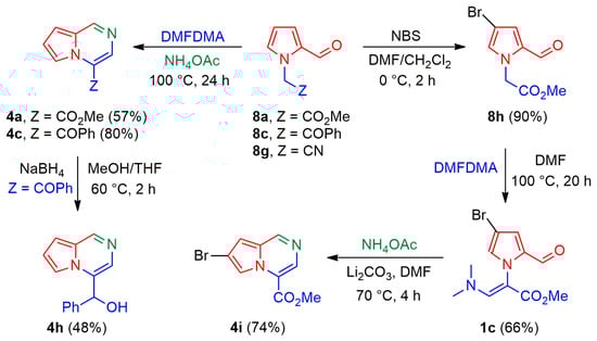As an alternative route, a multicomponent reaction was explored for the preparation of pyrrolo[1,2-a]pyrazines 4, starting from substituted pyrroles 8a, 8c, and 8g in the presence of DMFDMA and ammonium acetate (Scheme 3). Thus, pyrroles 8a and 8c were reacted with an excess of DMFDMA (5.0 mol eq.) and ammonium acetate (3.0 mol eq.) to provide the corresponding pyrrolo[1,2-a]pyrazines 4a and 4c in 57% and 80% yields, respectively. When comparing this one-step process to that of the previously described two-step procedure, the current overall yield was lower for 4a (57% vs. 74%) and higher for 4c (80% vs. 46%). The reduction of 4c with NaBH4 resulted in alcohol 4h in moderate yield. The reaction of 8g with DMFDMA generated a complex mixture of products that included the starting material.
