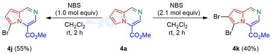 In the same context, pyrrolo[1,2-a]pyrazine 4a was brominated with an equimolar quantity of NBS to yield 6-bromopyrrolo[1,2-a]pyrazine 4j (Scheme 4), and the reaction of 4a with two mol equivalents of NBS furnished 6,7-dibromopyrrolo[1,2-a]pyrazine 4k.