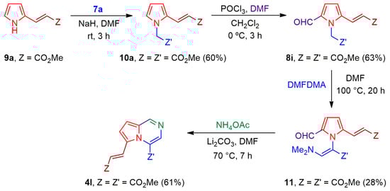 With the aim of expanding the scope of the methodology, the synthesis of 4,6-disubstituted pyrrolo[1,2-a]pyrazine 4l was undertaken. Starting from 6, alkyl 3-(pyrrol-2-yl)acrylate 9a was obtained by a Horner–Wadsworth–Emmons reaction, followed by N-alkylation with 7a to give pyrrole 10a, as reported [42] (Scheme 5). The latter was formylated under the usual Vilsmeier–Haack conditions to give rise to the respective 5-formyl analog 8i. Treatment of 8i with DMFDMA generated a complex mixture of products, from which it was possible to isolate the single Z isomer of enaminone 11 in low yield. Finally, the amination of the latter with ammonium acetate delivered the desired pyrrolo[1,2-a]pyrazine 4l in modest yield, in contrast to the high yields for 4a–g (Table 1).