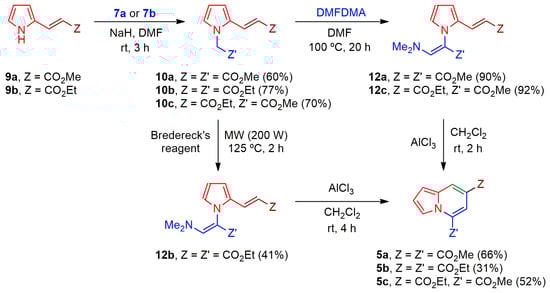 It was decided to start with similar enaminones to test a new approach for the construction of indolizines. Therefore, 9a or 9b were reacted with the corresponding methyl or ethyl bromoacetates 7a and 7b under basic conditions to afford pyrroles 10a–c [42], which were reacted with DMFDMA to convert them into enaminones 12a–c (Scheme 6). Unfortunately, enaminone 12b was formed in a mixture of methyl esters as a result of transesterification with the methoxy ions in the reaction medium. Hence, this compound was more efficiently obtained in modest yield when using Bredereck’s reagent under MW irradiation.