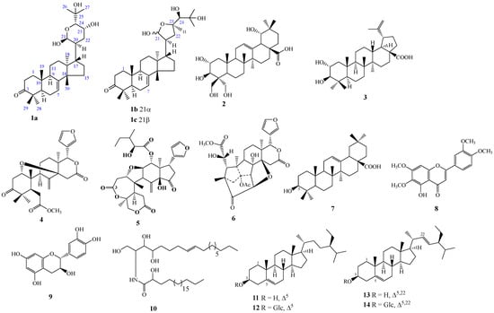 A mass of 275.0 g of the MeOH extract of K. senegalensis was partitioned into n-hexane (15.6 g) and EtOAc (160.8 g) fractions. Repeated column chromatography with Sephadex as well as silica gel as the stationary phase of the EtOAc (160.0 g) and n-hexane (15.0 g) extracts led to the isolation of 16 secondary metabolites, including nine triterpenoids (1abc–7), four steroids (11–14), two flavonoids (8–9) and one ceramide (10) (Figure 1).