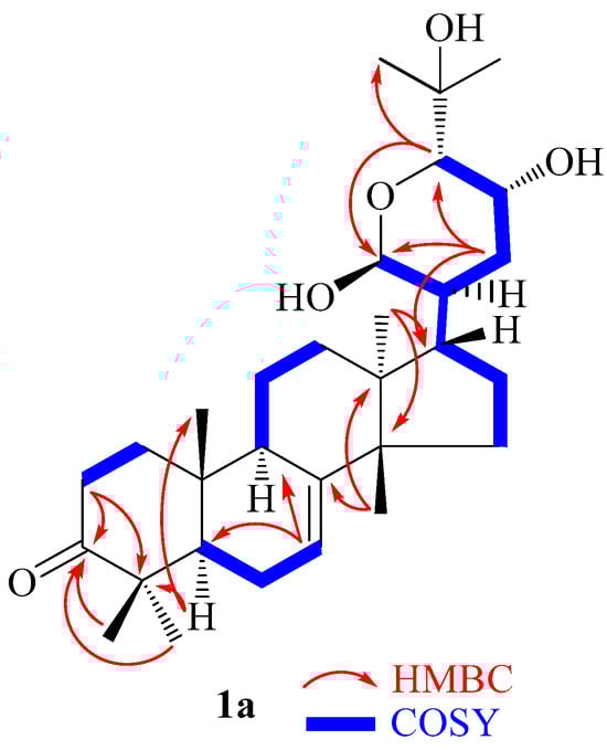 - 21β-hydroxybourjotinolone A (1a), white powder (MeOH); UV: 268, 365, 405, 666 nm; IR: 3 669–3 200, 2 964–2 869, 1 697, 1 488, 1 468, 1 444, 1 270, 1 070, 970 cm−1; HR-ESI-MS [M + Na]+ m/z 511.3394 (calculated for C30H48NaO5+, 511.3399); 1H NMR (CD3OD, 600 MHz) δ 2.04 (1H, m, H1)/1.47 (1H, m, H1), 2.84 (1H, brtd, J = 14.6, 5.6 Hz, H2)/2.19 (1H, brd, J = 14.6 Hz, H2), 1.75 (1H, brdd, J = 11.5, 6.0 Hz, H5), 2.13 (1H, m, H6)/1.28 (1H, m, H6), 5.35 (1H, brq, J = 3.1 Hz, H7), 2.38 (1H, m, H9), 1.62 (2H, m, H11), 1.99 (1H, m, H12)/1.81 (1H, m, H12), 2.20 (1H, m, H15)/2.17 (1H, m, H15), 1.87 (1H, m, H16)/1.31 (1H, m, H16), 1.85 (1H, m, H17), 0.91 (3H, s, H19), 1.05 (3H, s, H19), 2.12 (1H, m, H2O), 5.26 (1H, brd, J = 2.8 Hz, H21), 1.70 (1H, m, H22)/1.65 (1H, m, H22), 4.10 (1H, brt, J = 3.6 Hz, H23), 3.60 (1H, brd, J = 1.5 Hz, H24), 1.24 (3H, s, H26), 1.27 (3H, s, H27), 1.03 (3H, s, H28), 1.13 (3H, s, H29), 1.06 (3H, s, H30); 13C NMR (CD3OD, 150 MHz) δ 39.7 (C1), 35.9 (C2), 219.2 (C3), 49.1 (C4), 53.9 (C5), 25.1 (C6), 119.2 (C7), 147.2 (C8), 49.9 (C9), 36.2 (C10), 19.3 (C11), 31.1 (C12), 44.9 (C13), 52.4 (C14), 35.9 (C15), 27.7 (C16), 48.1 (C17), 23.2 (C18), 13.1 (C19), 40.0 (C20), 94.1 (C21), 32.3 (C22), 67.1 (C23), 73.6 (C24), 73.9 (C25), 26.8 (C26), 27.3 (C27), 25.1 (C28), 22.0 (C29), 28.1 (C30).