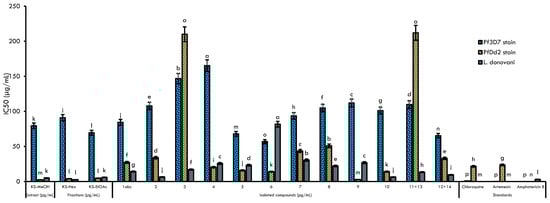 The MeOH crude extract from Khaya senegalensis stem bark, the fractions, and the isolated compounds were evaluated for their antiplasmodial activity against chloroquine-resistant Dd2 and chloroquine-sensitive 3D7 strains of Plasmodium falciparum as well as antileishmanial and cytotoxicity activities against the Leishmania donovani strain and RAW 264.7 cancer cell lines, respectively (Figure 3, Table 2). According to a previously published report, the antiplasmodial activity of these samples was categorized as follows: high (IC50 < 5 μg/mL), promising (5 ≤ IC50 < 15 μg/mL), moderate (15 ≤ IC50 < 50 μg/mL), and weak or inactive (IC50 ≥ 50 μg/mL) []. The crude extract of K. senegalensis (KS-MeOH) exhibited high antiplasmodial activity against PfDd2 coupled with a good selectivity index (SI) toward RAW cells (IC50 = 2.5 ± 0.12 μg/mL, SI 19) and was inactive against Pf3D7 (IC50 = 79.4 ± 0.33 μg/mL, SI 0.59). Consequently, the crude extract was found to be highly active against Leishmania donovani promastigotes (SI value of 9.28) with a moderate SI in RAW cells (IC50 = 5.12 ± 0.7 μg/mL, SI 0.59). Liquid-liquid partitioning of KS-MeOH afforded two fractions (KS-Hex and KS-EtOAc) that displayed equipotent antiplasmodial (Pf3D7: IC50 69.7–90.87 μg/mL−; PfDd2: IC50 4.05–4.78 μg/mL), antileishmanial (IC50 2.68–5.99 μg/mL−) and cytotoxic activities (SI_Pf3D7 0.72–0.88, SI_Pf3D7 10.59–10.93, SI Leish 8.45–30.12).