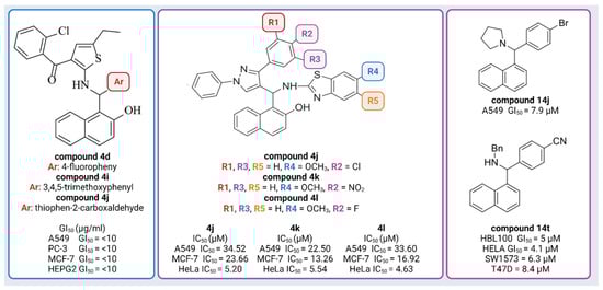 Examples of Betti compounds with profound antiproliferative activity against various cell lines. Created with Biorender.com, accessed on 6 March 2023.