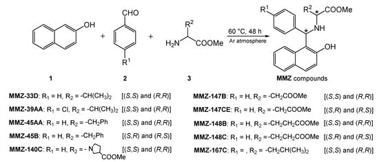 We have recently subjected chiral d- and l-amino acid methyl esters to the Betti reaction to obtain a library of new amino acid derivatives of Betti bases, the MMZ compounds (Figure 2), which appear to be of interest over a wide range of bioactivities. Note that we present first examples of Betti reaction with methyl derivatives of (R)-waline, (S)-phenyl alanine, (S)-proline, (S)-glutamic acid, (S)-aspartic acid, and (S)-leucine.