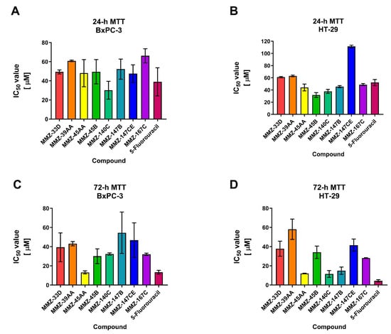 Results of 24 h (A,B) and 72 h (C,D) MTT assay: mean IC50 ± SD values obtained for MMZ-33D, MMZ-49AA, MMZ-45AA, MMZ-45B, MMZ-140C, MMZ-147B, MMZ-147CE, and MMZ-167C compounds, and 5-Fluorouracil in BxPC-3 and HT-29 cells.