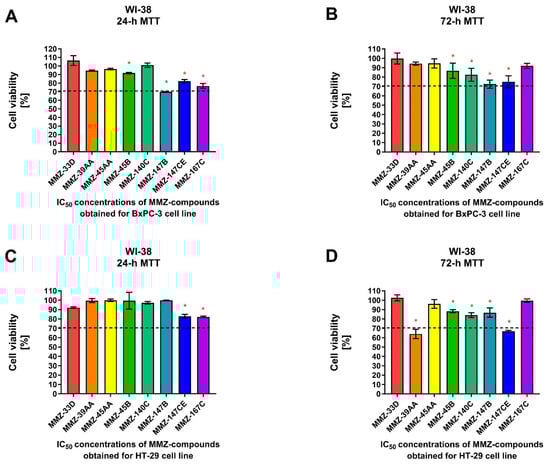 Cell viability of normal human lung fibroblast cells (WI-38) after 24 and 72 h treatment with MMZ compounds used in IC50 concentrations obtained in the MTT assay for BxPC-3 (A,B) and HT-29 (C,D) cell lines following respective 24 or 72 h incubation times. Data are presented as the percentage of cell viability (% cell viability ± SD). The differences between the experimental samples and control group (100% viability/DMSO-treated) were evaluated by the ANOVA test followed by Dunnett’s test. Asterisk (*) indicates significant difference compared to the control group.