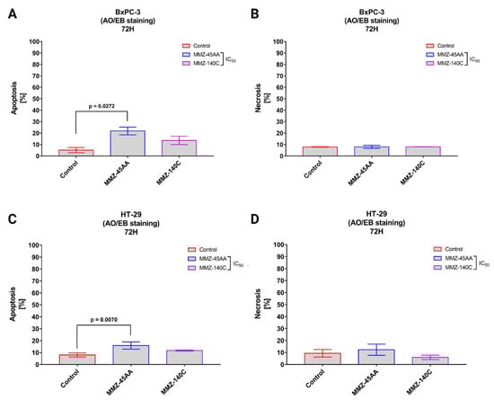 Dual Acridine Orange/Ethidium Bromide (AO/EB) combines the distinct uptake of fluorescent DNA-binding dyes AO and EB with the morphologic feature of chromatin condensation in the stained nucleus to differentiate between live, apoptotic, and necrotic cells [29]. MMZ-45AA and MMZ-140C were chosen for further studies and analyzed for apoptosis and necrosis induction in BxPC-3 (Figure 6A,B) and HT-29 cells (Figure 6C,D).