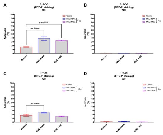 Flow cytometry with Annexin V conjugated with fluorescein isothiocyanate (FITC) and propidium iodide (PI) is a popular approach for determining cell apoptosis and necrosis. Annexin V is a protein with a high affinity for phosphatidylserine, which is found on the outer membrane surface of apoptotic cells. PI is a fluorescent dye that stains the DNA of necrotic cells with damaged plasma membranes [30]. Similarly to AO/EB staining, we used MMZ-45AA and MM-140C compounds to further assess apoptosis/necrosis induction in BxPC-3 cells (Figure 7A,B) and HT-29 (Figure 7C,D) after exposure to the compounds in their respective IC50 concentrations.