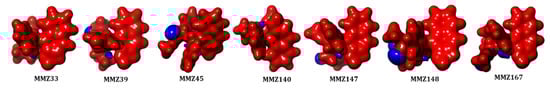The blood–brain barrier, often known as the BBB, is the protective measure that separates the tissues of the brain from the substances that are flowing in the circulatory system in the blood. It is also a diffusion barrier that permits the penetrance of water and small, lipophilic molecules into the brain under their concentration gradients [37]. To create drugs that are both effective and efficient, it is necessary to have a solid understanding of how drug molecules interact with the BBB [38]. Among MMZ compounds, MMZ-33, -39, -45, and -140 were found to have physicochemical properties that allow their BBB permeability.