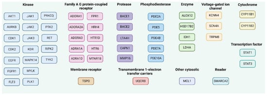 The predicted molecular targets for MMZ compounds in Homo Sapiens as the selected organism model using SwissTargetPrediction, accessed on 26 February 2023 and ordered given the protein function. The common targets for MMZ compounds are mentioned as one target. Created with Biorender.com.
